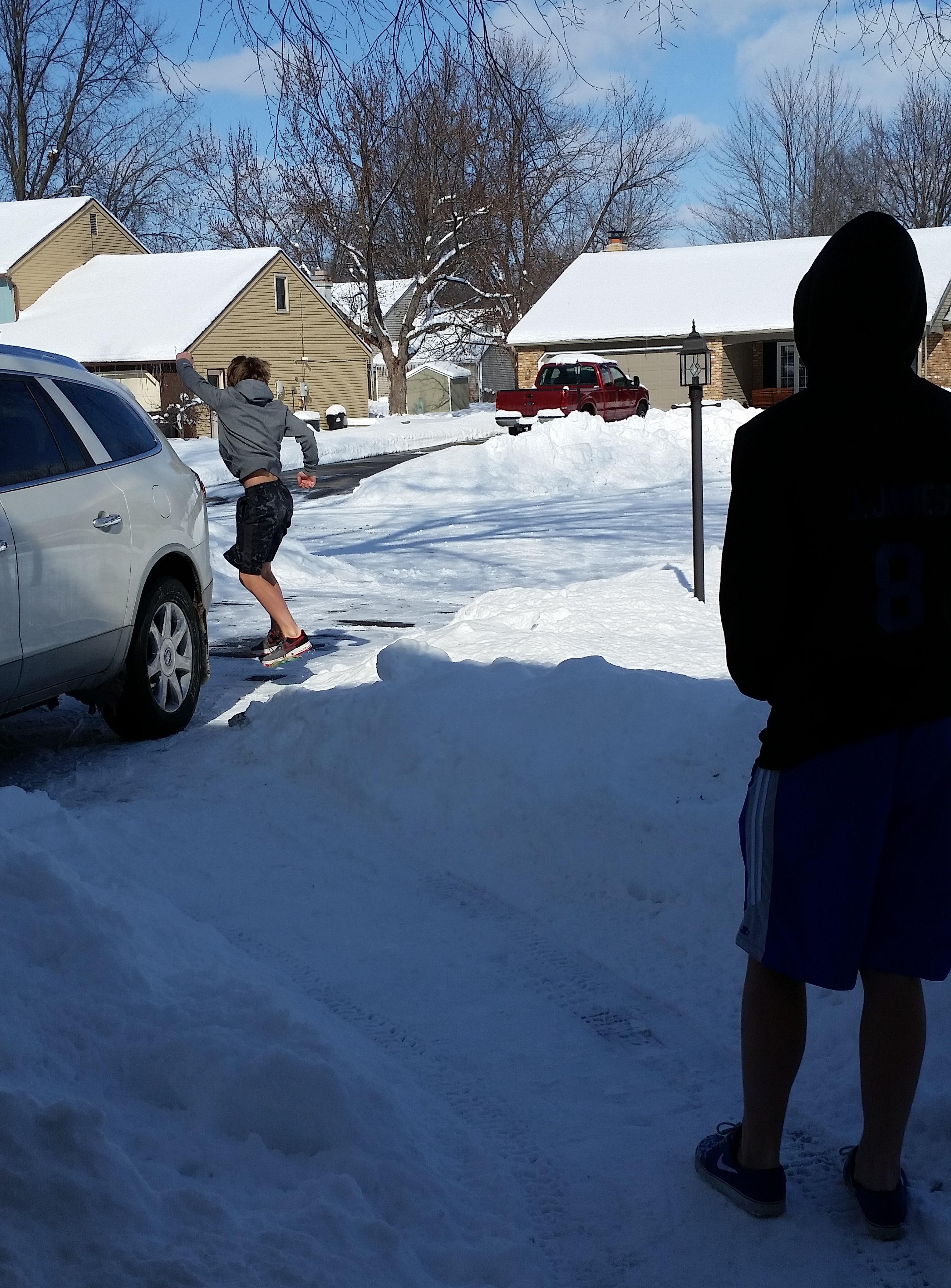 This would be Charlie. With a skateboard strapped to his shoes. De-wheeled, of course, because voila! Snowboard! Funny thing about de-wheeled skateboards with shoes tied to them… they don’t really function like a REAL snowboard. This makes for a lot of hopping around.